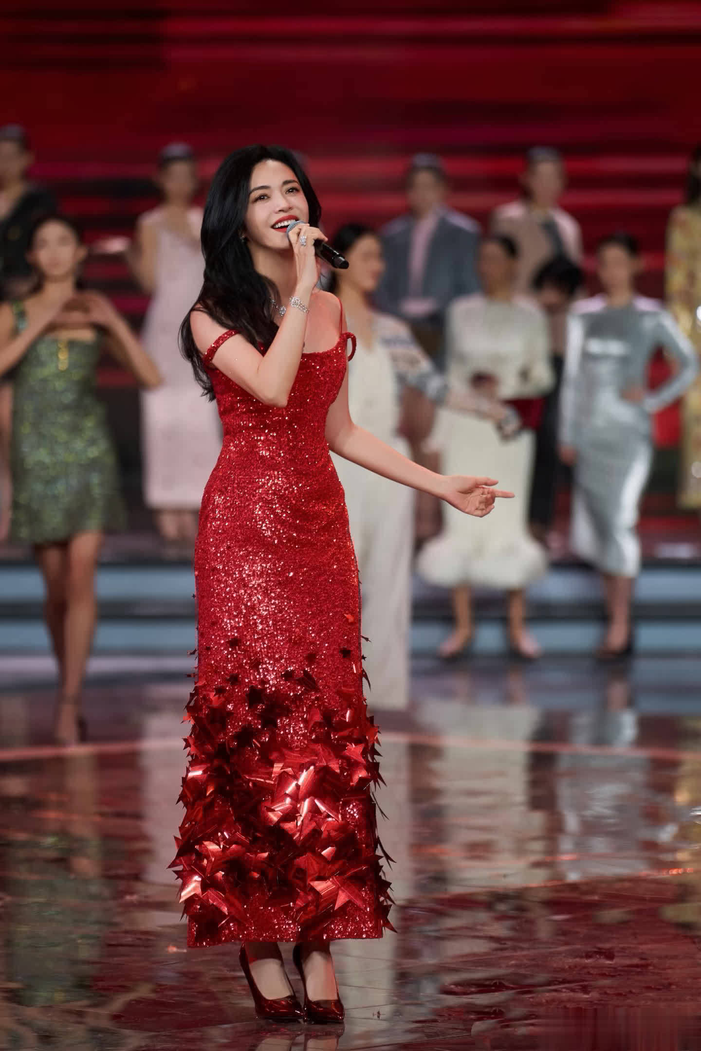 她穿一袭红色吊带裙,修身剪裁 + 闪片元素,勾勒出曼妙的体型。裙摆的缀化元素、增添浪漫细节,搭配一双高跟鞋女人味十足。